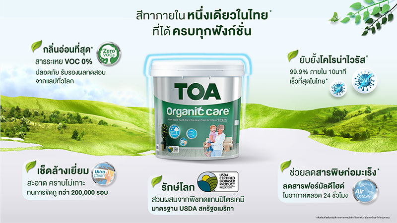 TOA Organic care - Asthma & Allergy Friendly Plant based Emulsion Paint เป็นสีที่พัฒนาขึ้นเป็นพิเศษเพื่อความปลอดภัยที่เหนือกว่าของทุกชีวิตในบ้าน ด้วยเทคโนโลยี Biobased จากสหรัฐอเมริกา ที่ใช้ส่วนผสมจากธรรมชาติ ทดแทนวัตถุดิบจากปิโตรเลียม ปลอดสารก่อภูมิแพ้ ให้กลิ่นอ่อนพิเศษ สารระเหย VOCs 0% ผ่านการรับรองมาตรฐาน BioPreferred จาก USDA สหรัฐอเมริกา รายแรกและรายเดียวในประเทศไทย ให้ความทนทาน การเช็ดล้างที่ยอดเยี่ยม