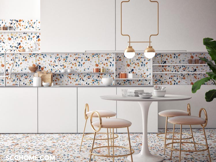 ห้องครัว เป็นส่วนที่นิยมปูกระเบื้องพื้นอยู่แล้ว เพราะทำความสะอาดได้ง่าย ไม่ต้องกลัวเลอะเทอะเหมือนวัสดุประเภทอื่น การเลือกใช้กระเบื้องพอร์ซเลนและแกรนิตโต้จึงเป็นการเพิ่มความทนทาน เพราะรับน้ำหนักได้ดีกว่าและทนต่อรอยขูดขีด นอกจากนี้ในปัจจุบันยังมีการผลิตกระเบื้องแผ่นใหญ่ ที่สามารถประยุกต์นำมาทำท็อปเคาน์เตอร์ได้ด้วย