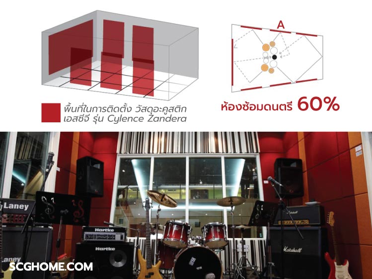 ภาพ: ห้องซ้อมดนตรี แนะนำให้บุ “วัสดุอะคูสติก เอสซีจี รุ่น Cylence Zandera” บนผนังเดิม 60%