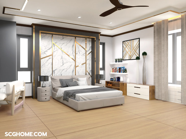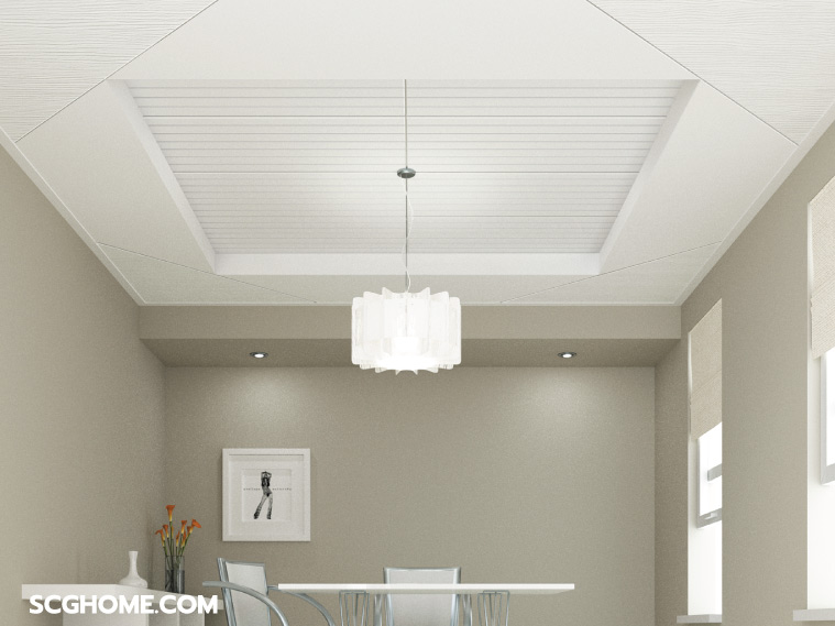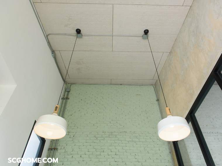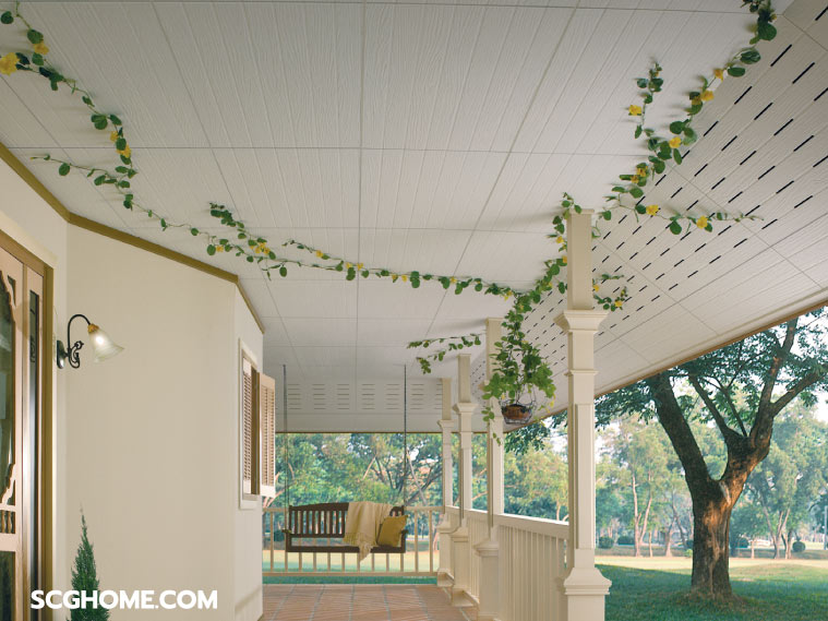 ภาพ: การใช้งานฝ้าสมาร์ทบอร์ด ในลักษณะผสมผสานทั้งแบบเรียบ เซาะร่อง และลายไม้