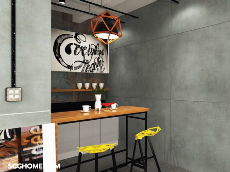 ภาพ: การใช้งานแผ่นซีเมนต์บอร์ดแบบโชว์พื้นผิวในงานตกแต่งผนังสไตล์ลอฟต์
